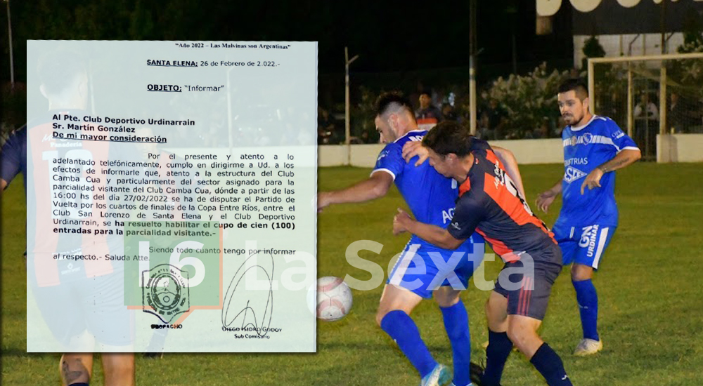 Según registró La Sexta, este sábado por la tarde el club de Urdinarrain publicó una nota enviada por el Jefe de la Comisaría Nº 15 de Santa Elena, Diego Godoy, en la que se les notificaba que atento a la estructura del club, y sobre todo el sector asignado a los visitantes, "se ha resuelto habilitar el cupo de 100 entradas para la parcialidad visitante".