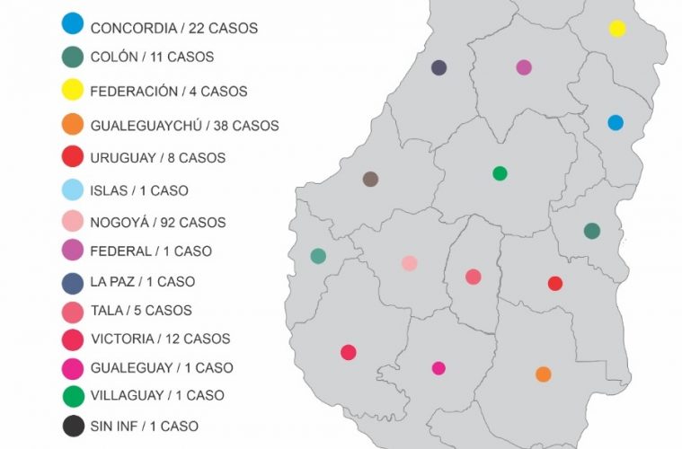 El último reporte de la Dirección de Epidemiología del Ministerio de Salud, menciona que entre las ciudades con más casos se encuentra Paraná, con 126 infectados, y le siguen Nogoyá con 92; Gualeguaychú con 38; Concordia con 22; entre otras. El departamento La Paz aparece en lo más bajo con solo un caso.