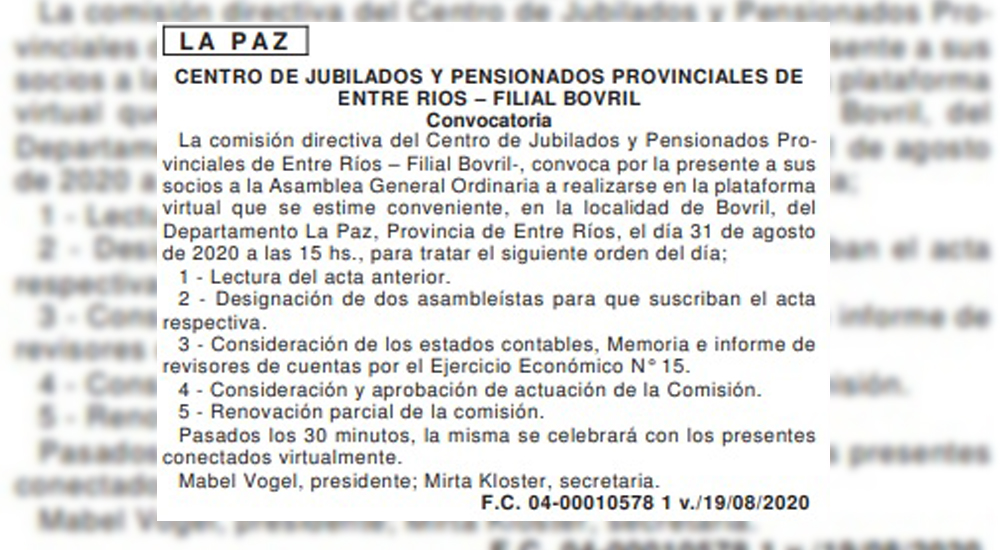 El Centro de Jubilados y Pensionados Provinciales de Entre Ríos, filial Bovril, convocó a sus socios a la Asamblea General Ordinaria. La misma se realizará el 31 de este mes y será en la modalidad virtual debido a la pandemia.
