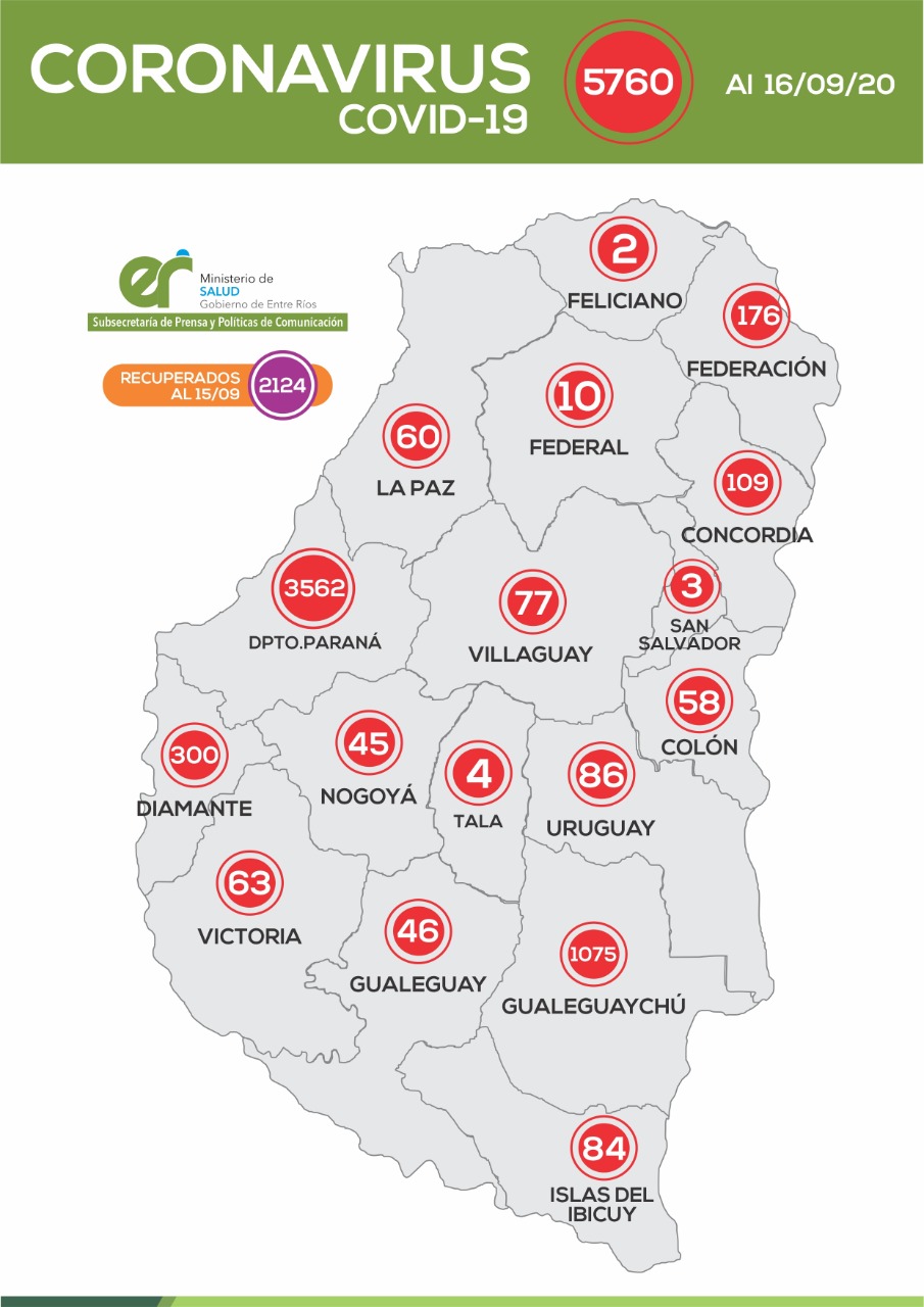 El Ministerio de Salud de Entre Ríos confirmó este miércoles 143 nuevos casos de coronavirus en la provincia, de los cuales dos se registraron en el departamento La Paz, donde suman 60 contagios desde que comenzó la pandemia.