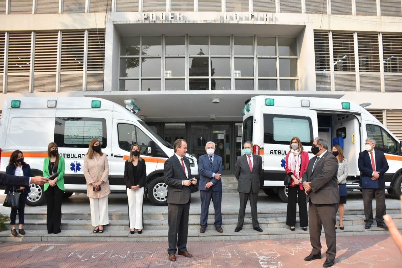 Durante una ceremonia efectuada hoy en la explanada de los Tribunales de Paraná, el Superior Tribunal de Justicia de Entre Ríos (STJER) entregó al gobierno provincial dos nuevas ambulancias adquiridas con lo recaudado por el Fondo Solidario, creado por el alto cuerpo como contribución para afrontar la emergencia sanitaria con motivo del Covid-19. El acto fue encabezado por el presidente del STJER, Martín Carbonell y el gobernador Gustavo Bordet.