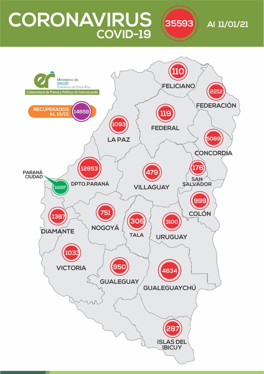 En virtud de los datos reportados al 11 de enero de 2021 por el área de Vigilancia Epidemiológica del Ministerio de Salud, en Entre Ríos se han sumado 663 casos de coronavirus, los que corresponden a los últimos dos días.