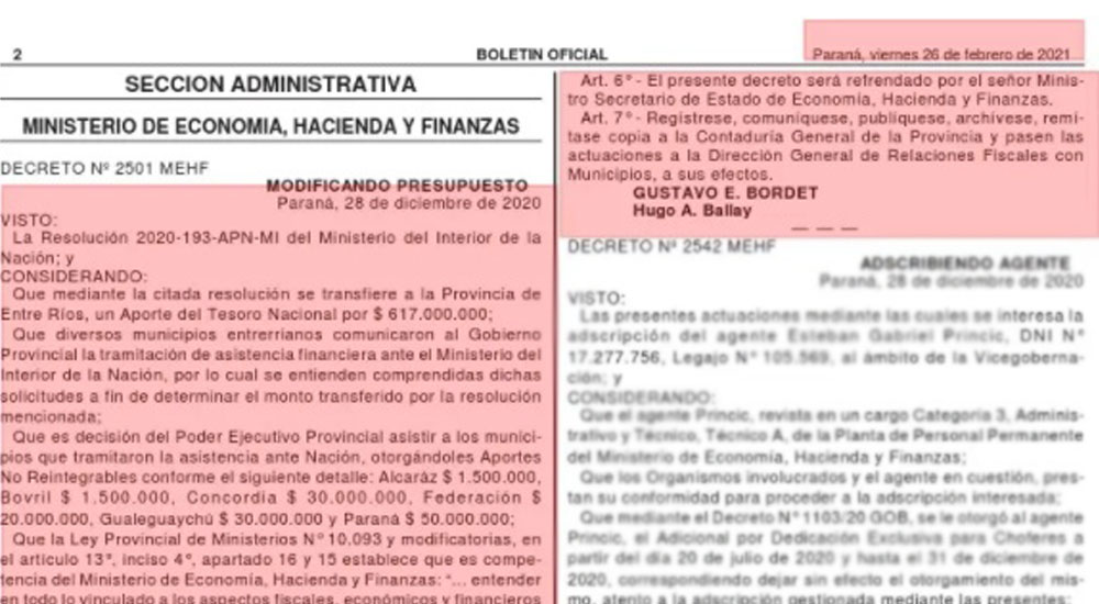 La información fue difundida en el Boletín Oficial del 26 de febrero. Allí se indicó que a través del decreto Nº 2501, del 28 de diciembre de 2020, el ministerio del Interior transfirió a la Provincia un Aporte del Tesoro Nacional por $617.000.000. De ese total, $130 millones fueron distribuidos entre seis municipios. El decreto fue firmado por el gobernador Gustavo Bordet y el ministro de Economía, Hugo Ballay.
