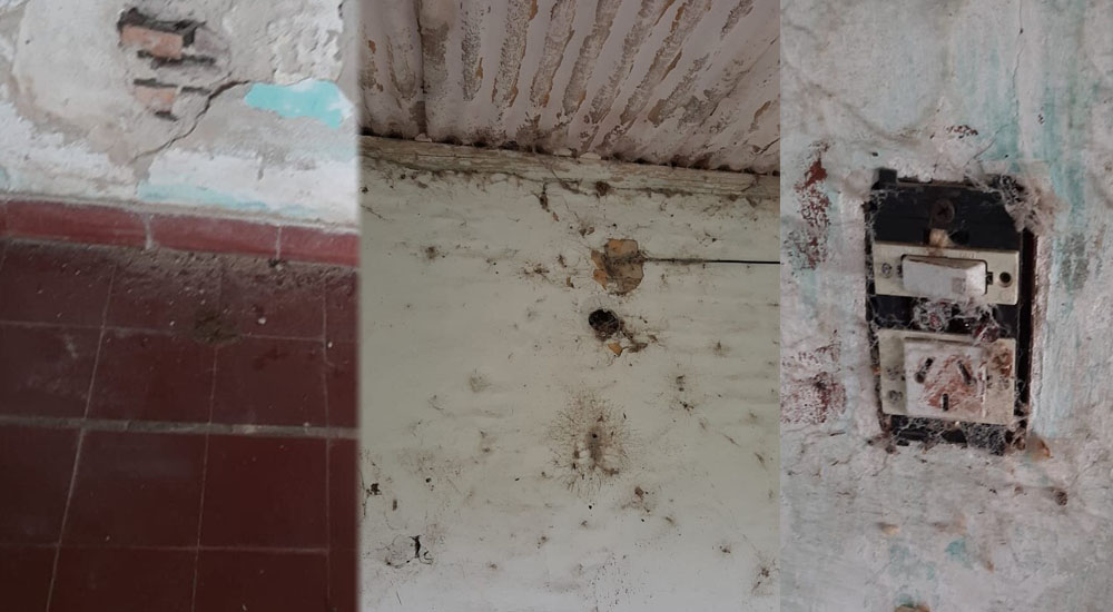 Las imágenes muestran un edificio extremadamente deteriorado: techos, paredes y pisos desvencijados; y conexiones eléctricas precarias.