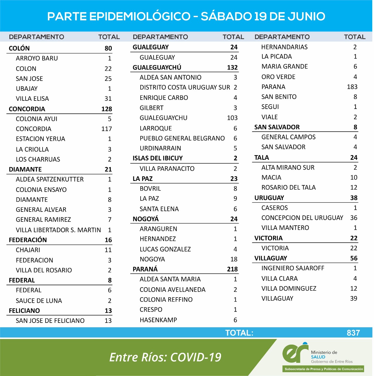 El área de Vigilancia Epidemiológica del Ministerio de Salud confirmó que en Entre Ríos este sábado se registraron 837 nuevos casos de coronavirus.