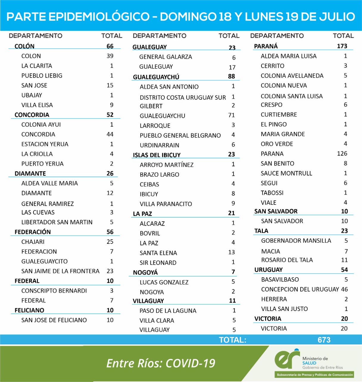 El área de Vigilancias Epidemiológica del Ministerio de Salud, confirmó que en Entre Ríos entre este domingo y lunes se registraron 673 nuevos casos de coronavirus. Los mismos se distribuyen en 467 del domingo 18 y 206 del lunes 19 de julio.