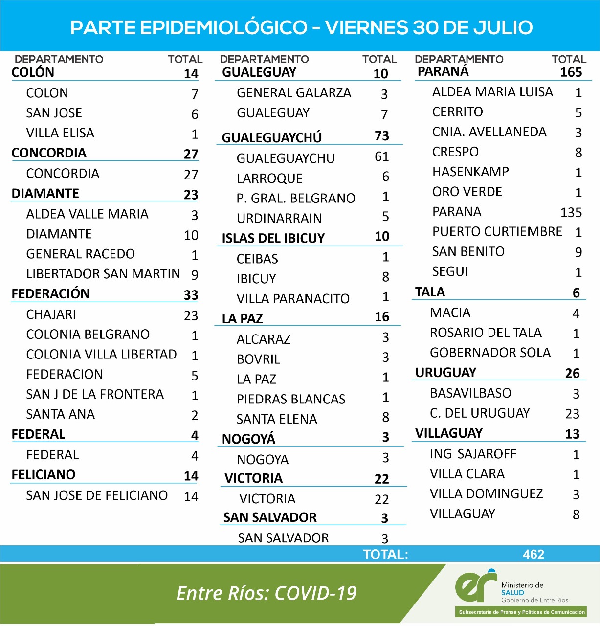 El área de Vigilancia Epidemiológica del Ministerio de Salud confirmó que en Entre Ríos este viernes se registraron 462 nuevos casos de coronavirus.