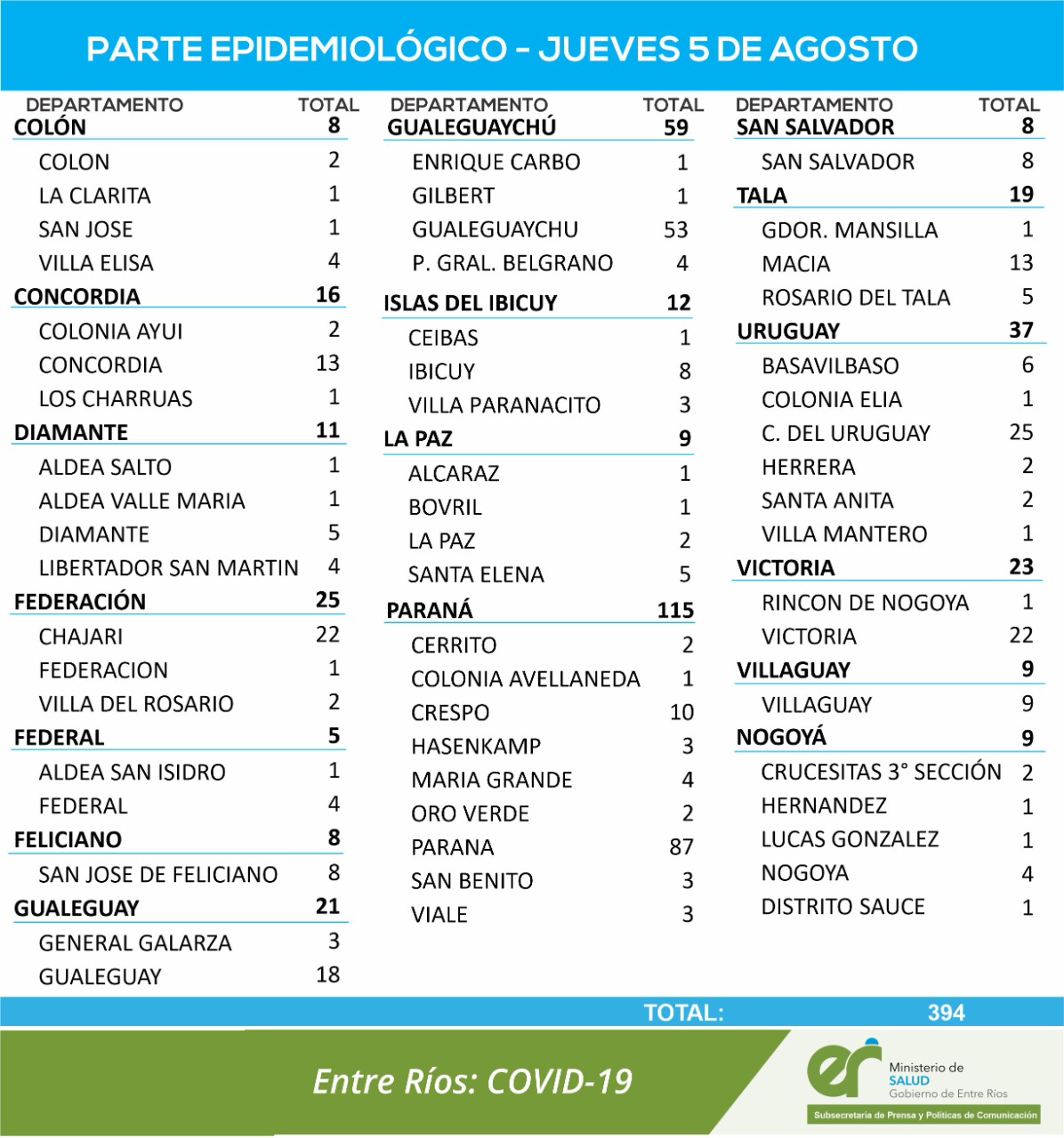 El área de Vigilancia Epidemiológica del Ministerio de Salud confirmó que en Entre Ríos este jueves se registraron 394 nuevos casos de coronavirus.
