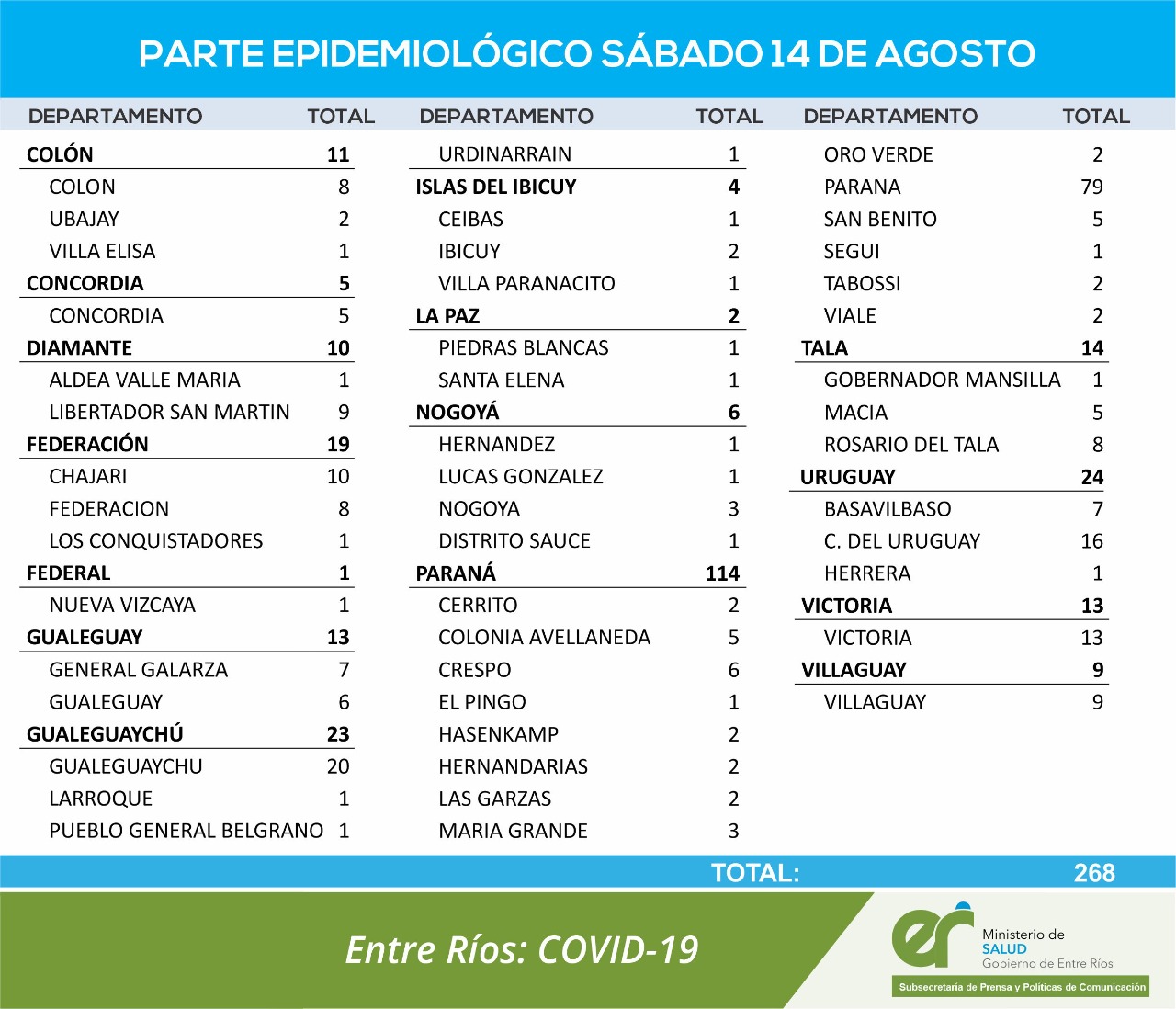 El área de Vigilancia Epidemiológica del Ministerio de Salud confirmó que en Entre Ríos este sábado se registraron 268 nuevos casos de coronavirus.