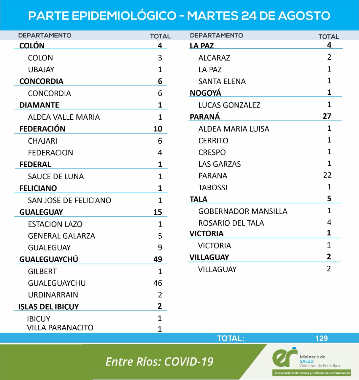El área de Vigilancia Epidemiológica del Ministerio de Salud confirmó que en Entre Ríos este martes se han sumado 129 casos de coronavirus.