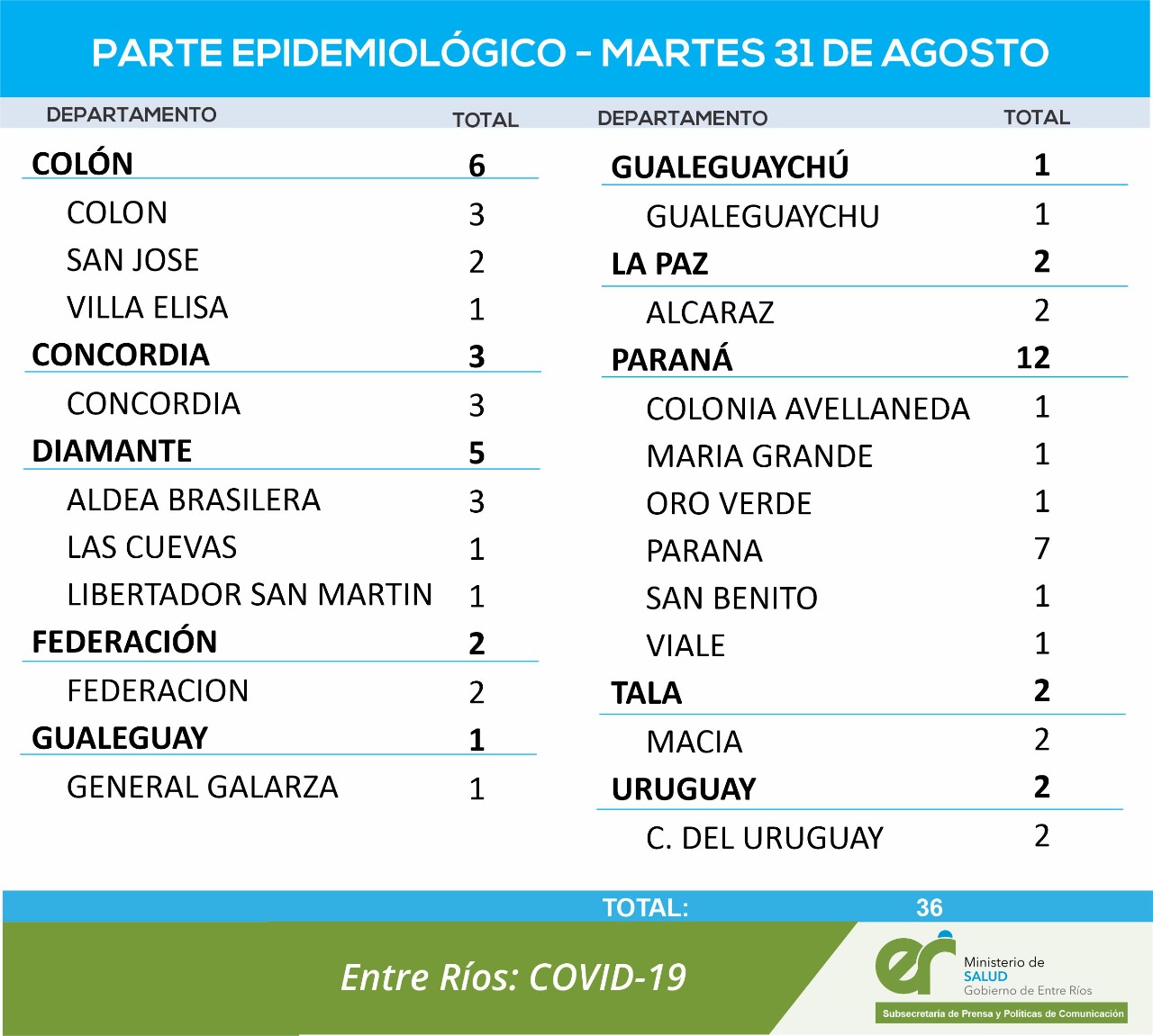 El área de Vigilancia Epidemiológica del Ministerio de Salud confirmó que en Entre Ríos este martes se registraron 36 nuevos casos de coronavirus, de los cuales solo dos corresponden al departamento La Paz, más precisamente a Alcaraz.