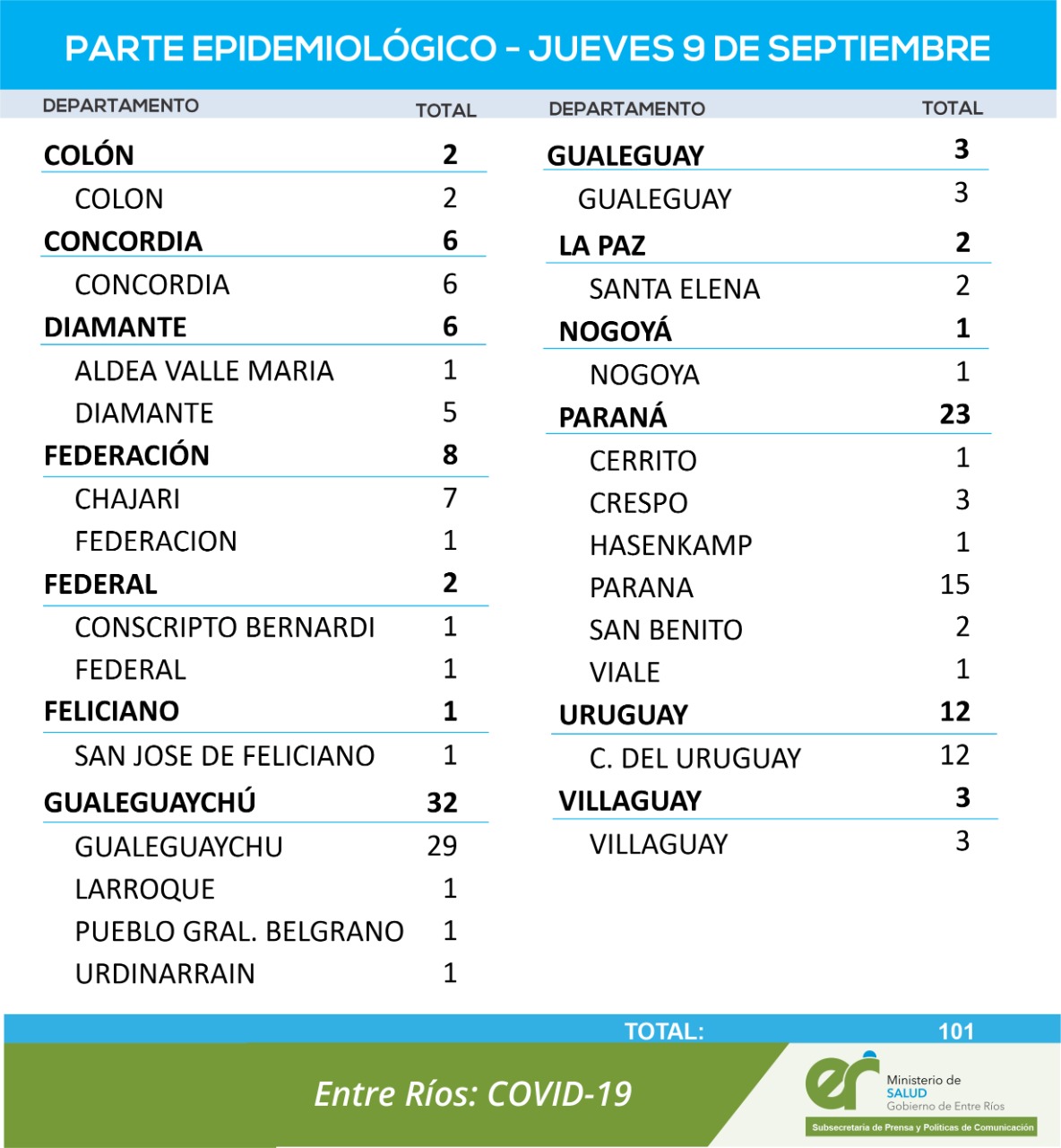 El área de Vigilancia Epidemiológica del Ministerio de Salud confirmó que en Entre Ríos este jueves 9 de septiembre se registraron 101 nuevos casos de coronavirus.
