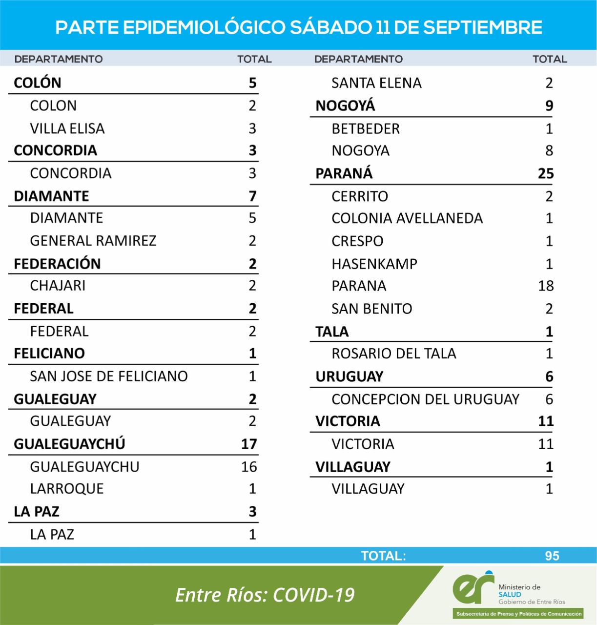 El área de Vigilancia Epidemiológica del Ministerio de Salud confirmó que en Entre Ríos este sábado 11 de septiembre se registraron 95 nuevos casos de coronavirus.