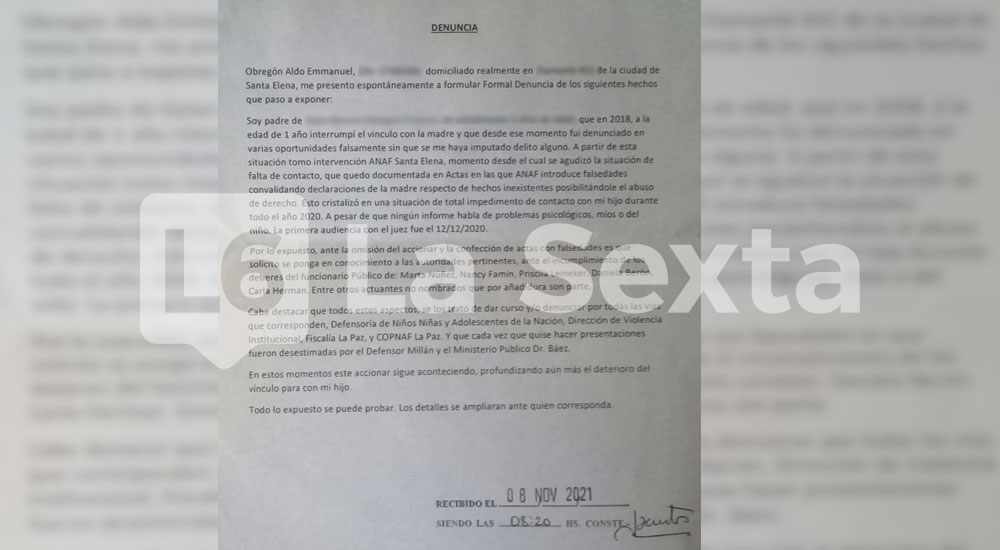 Obregón, quien integra la asociación nacional denominada Infancias Compartidas, sostiene en su denuncia que "a la edad de 1 año (de su hijo) interrumpí el vínculo con la madre y desde ese momento fui denunciado en varias oportunidades falsamente sin que se me haya imputado delito alguno. A partir de esta situación tomó intervención Anaf Santa Elena, momento desde el cual se agudizó la situación de falta de contacto, que quedó documentada en actas en las que Anaf introduce falsedades convalidando declaraciones de la madre, respecto de hecho inexistentes posbilitándole el abuso de derecho. Esto cristalizó en una situación de total impedimento de contacto con mi hijo durante todo el año 2020. A pesar de que ningún informe habla de problemas psicológicos, míos o del niño. La primera audiencia con el juez fue el 12/12/2020".