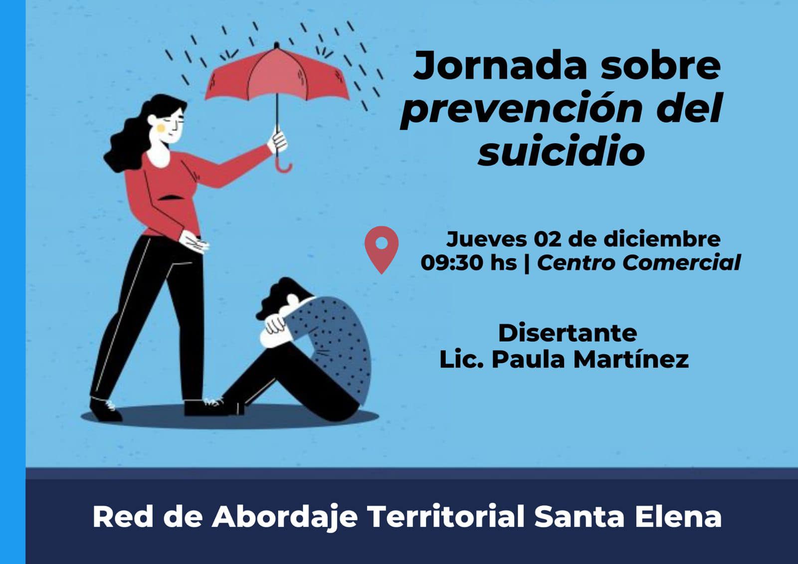 La actividad, organizada desde la Red de Abordaje Territorial Santa Elena, será el viernes 2 de diciembre en el Centro Comercial de la ciudad y estará a cargo de la licenciada en Psicología y especialista en suicidología, Paula Martínez.
