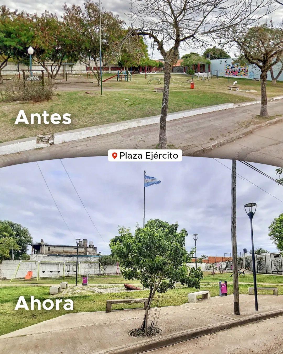 Al respecto, el intendente Bruno Sarubi mostró una imagen que muestra el antes y después de la revalorización de la plaza: "Cada espacio que seguimos revalorizando, es un paso más hacia una ciudad mejor", dijo.