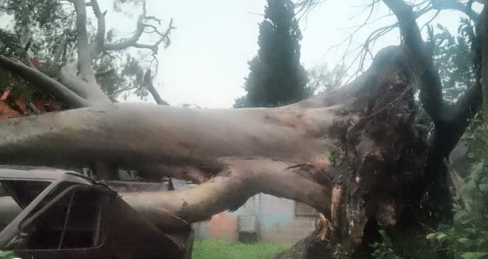 Se registraron fuertes vientos e intensas lluvias, los que provocaron voladura de techos, caída de árboles y postes, además de anegamiento de viviendas y comercios en la ciudad.