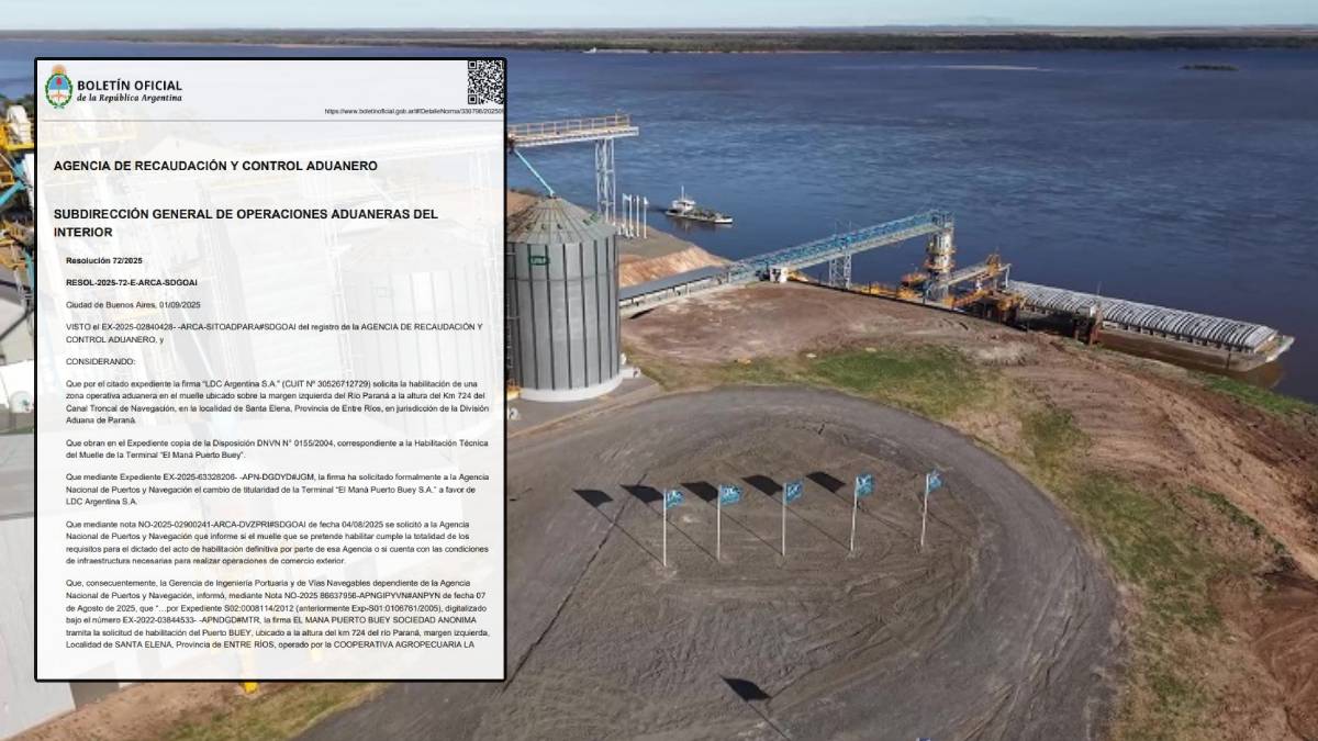 Mdiante la Resolución 72/2025, la Agencia de Recaudación y Control Aduanero autorizó la habilitación de una zona operativa aduanera a la altura del kilómetro 724 del Río Paraná, en Santa Elena. La medida, publicada este jueves en el Boletín Oficial de la Nación, fue adoptada a pedido de la empresa Louis Dreyfus Company (LDC), que el 5 de agosto inauguró sus instalaciones en la localidad. La zona operativa aduanera que acaba de ser autorizada está ubicada en la margen izquierda, km 724 del Canal Troncal de Navegación, en jurisdicción de la División Aduana de Paraná.