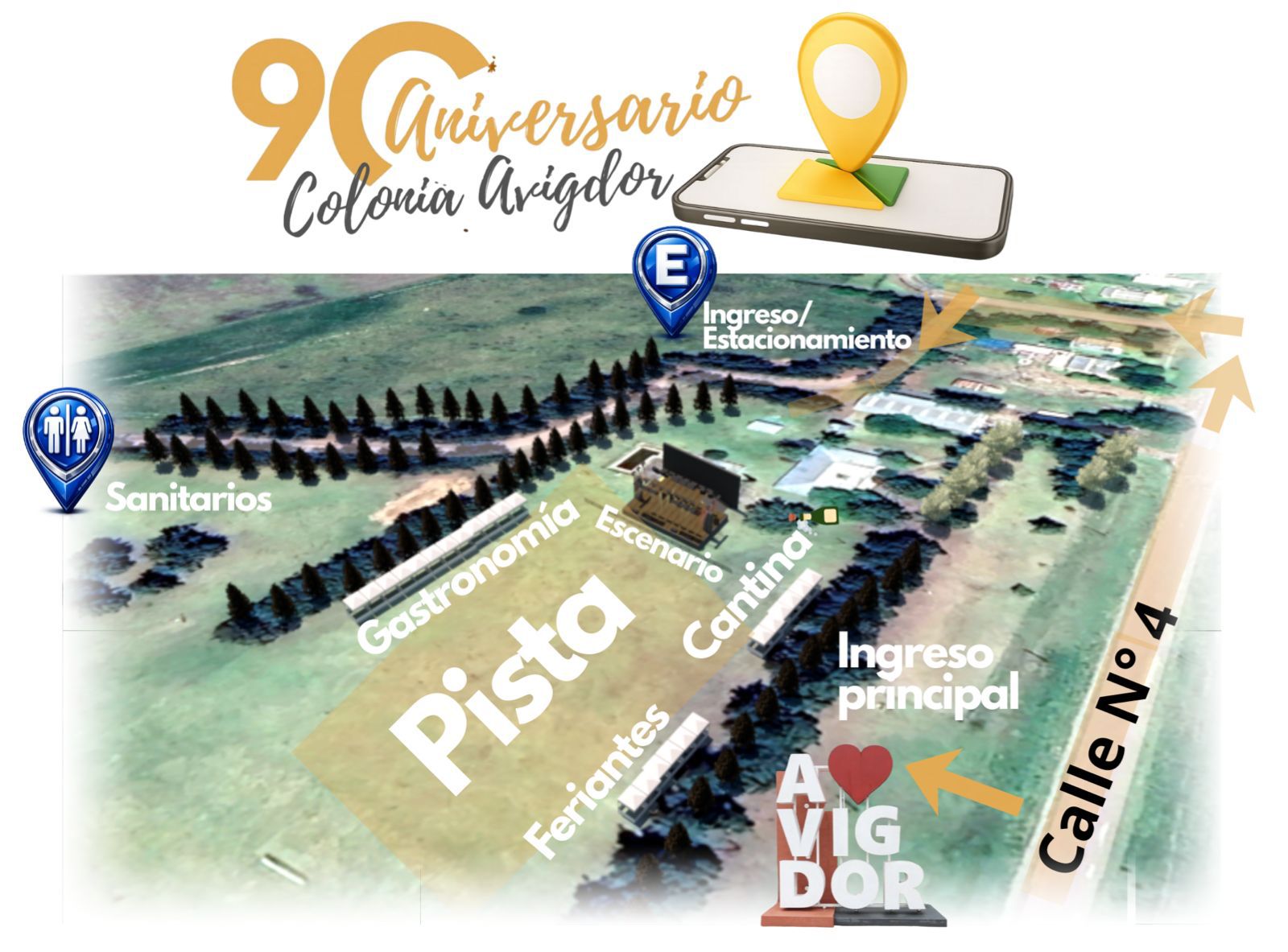 En el marco de los festejos, la Comuna de Colonia Avigdor dio a conocer el mapa oficial de ingreso y organización del predio, con el objetivo de facilitar la circulación y garantizar una celebración ordenada. El ingreso principal será por calle N°4, desde donde se podrá acceder a los distintos sectores dispuestos para el escenario, la feria, la gastronomía, la cantina y los sanitarios.