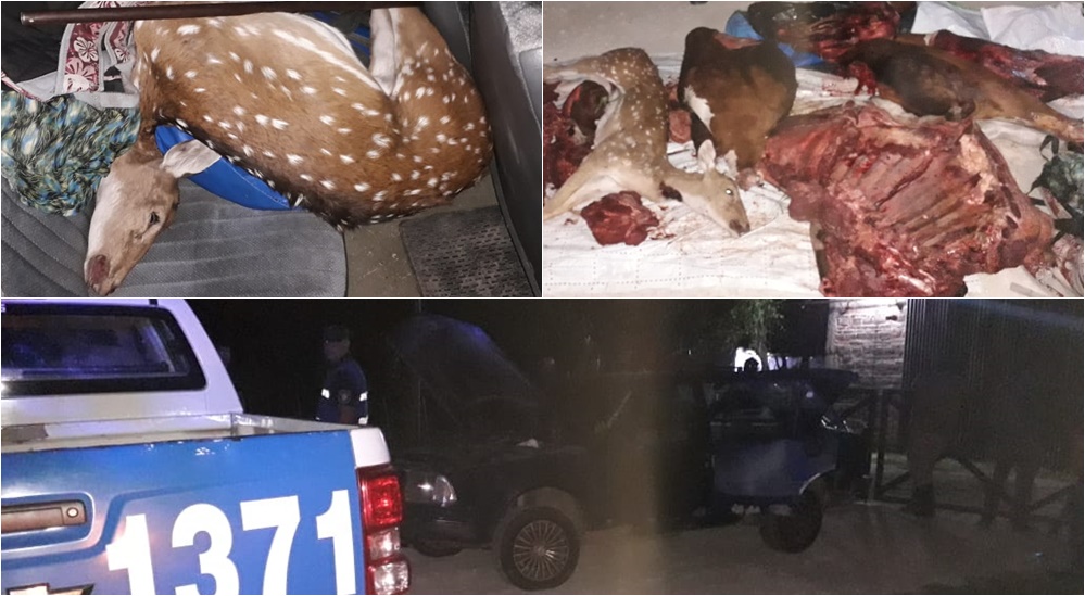 Esta maniobra disuasiva, originó que los uniformados se acercaran al punto y procedieran a la identificación del rodado, donde constataron que "los ocupantes tenían en su poder un arma de fuego (escopeta) en la parte posterior del auto, sus ropas se encontraban con manchas de sangre y en el asiento trasero, entre los dos ocupantes, llevaban un ciervo axis eviscerado y partes de animal vacuno recientemente faenado, que aún contaba con el cuero", indicaron.