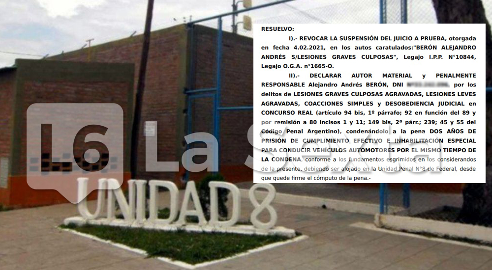 Así las cosas, Berón fue condenado a dos años de prisión de cumplimiento efectivo e inhabilitación especial para conducir vehículos automotores por el mismo tiempo de la condena, por los delitos de lesiones graves culposas agravadas, lesiones leves agravadas, coacciones simples y desobediencia judicial.