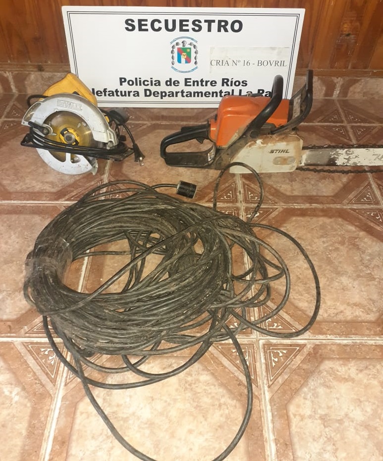 En el domicilio de Avenida Urquiza de Bovril, la Policía secuestró un alargue negro de 25 metros de cable, una motosierra marca Sthill MS 180 y una sierra circular amarilla marca Dewalt 1400 Watts de potencia, informaron las fuentes policiales a La Sexta.