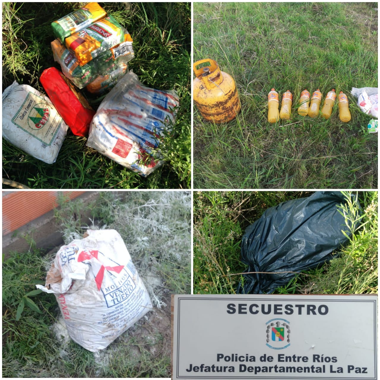 Personal de la Comisaría de Bovril "comenzó a realizar un rastrillaje en la zona aledaña a la finca del denunciante", y "en terrenos baldíos se logró dar con elementos que habían sido abandonados: seis jugos Baggio, seis paquetes de azúcar, una garrafa de 10 kilos, una horma de queso cremoso de 4 kilos, una horma de queso en barra de 4 kilos, 10 paquetes de yerba de 1/2 kilo, un pack de diez paquetes de azúcar de 1 kilo cada uno", detallaron a La Sexta desde la Departamental La Paz de Policía.