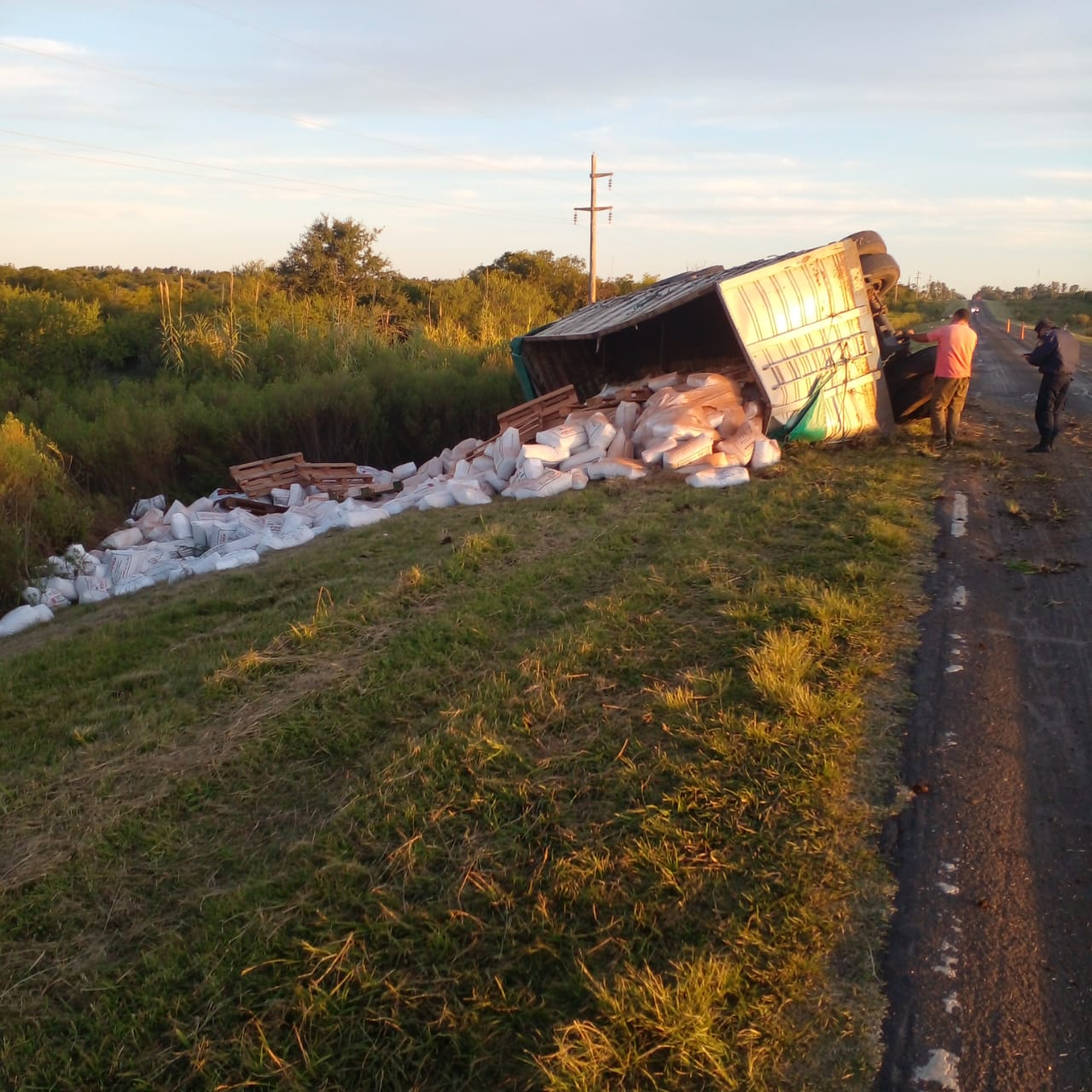 El acoplado de un camión VolksWagen 17220 que transportaba alimento balanceado, volcó y tiró su carga, la tarde de este sábado en el kilómetro 603 de la Ruta Nacional N° 12, en jurisdicción de La Paz.