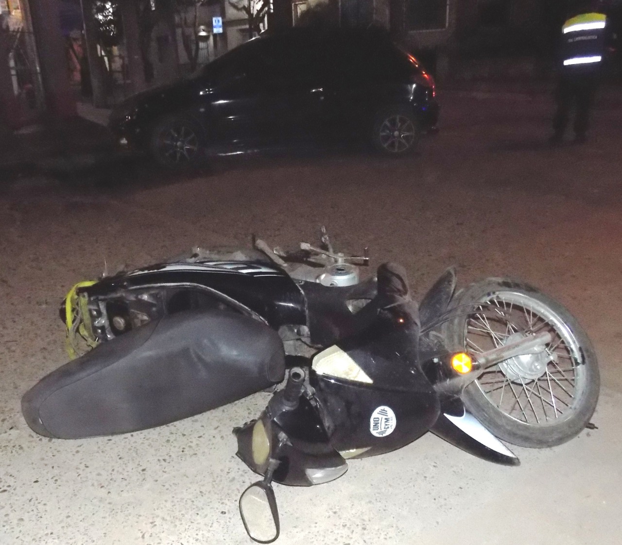 Según informó la Jefatura Departamental La Paz de Policía, la colisión se dio entre un automóvil, conducido por un hombre de 35 años, quien circulaba por Calle Berutti, en sentido este-oeste; y una motocicleta, manejada por uno de 32 años, que circulaba en por San Martín, en sentido sur-norte. Para investigar responsabilidades en el siniestro, intervino la División Criminalística de la Policía.
