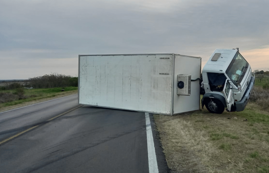 Un camión térmico terminó volcando en las primeras horas de este miércoles en la Ruta Nacional N°12, en el kilómetro 567 en el departamento La Paz. El vehículo de gran porte terminó de ese modo luego de esquivar un animal y rozar a una camioneta. Afortunadamente, el conductor salió ileso.