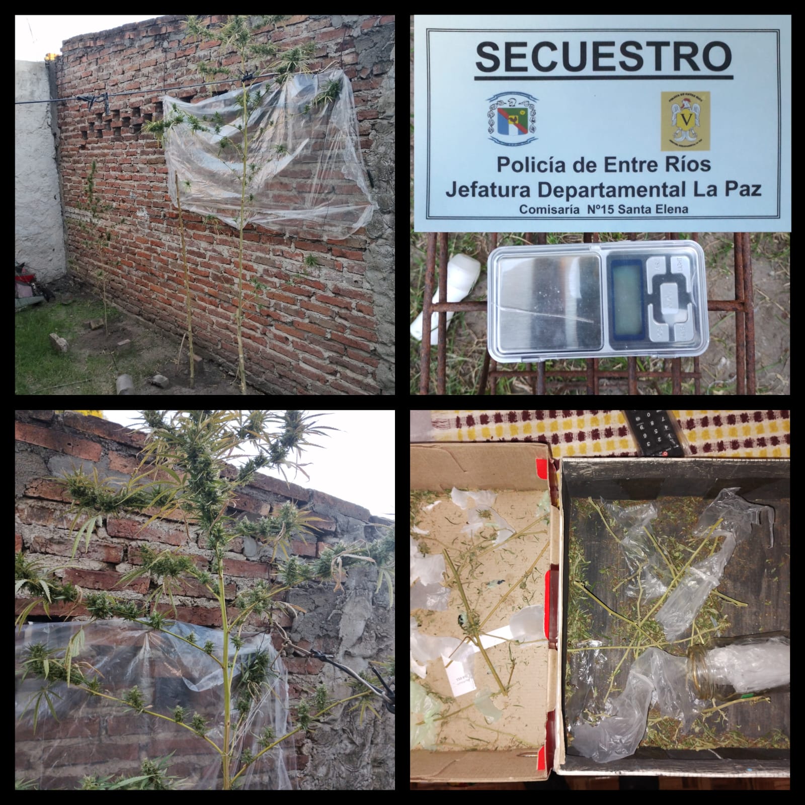 Indicaron, además, que "luego de ser excluído el individuo de 30 años, se reintegró a la víctima al domicilio, quien exhibió dos cajas de cartón que contenían restos de hojas, posiblemente marihuana, recortes de bolsas de nylon, un frasco de vidrio, como así también en el patio trasero se visualizan tres plantas de cannabis sativa de importante dimensión y una calculadora digital", todo lo cual fue secuestrado en el marco de la Ley Nacional 23.737, señalaron desde la Policía.