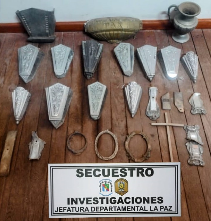 Personal de Investigaciones de la Departamental La Paz de Policía recuperó diversos elementos de bronce que fueron robados por autores desconocidos, producto de la profanación de tumbas en el Cementerio Municipal de la ciudad.