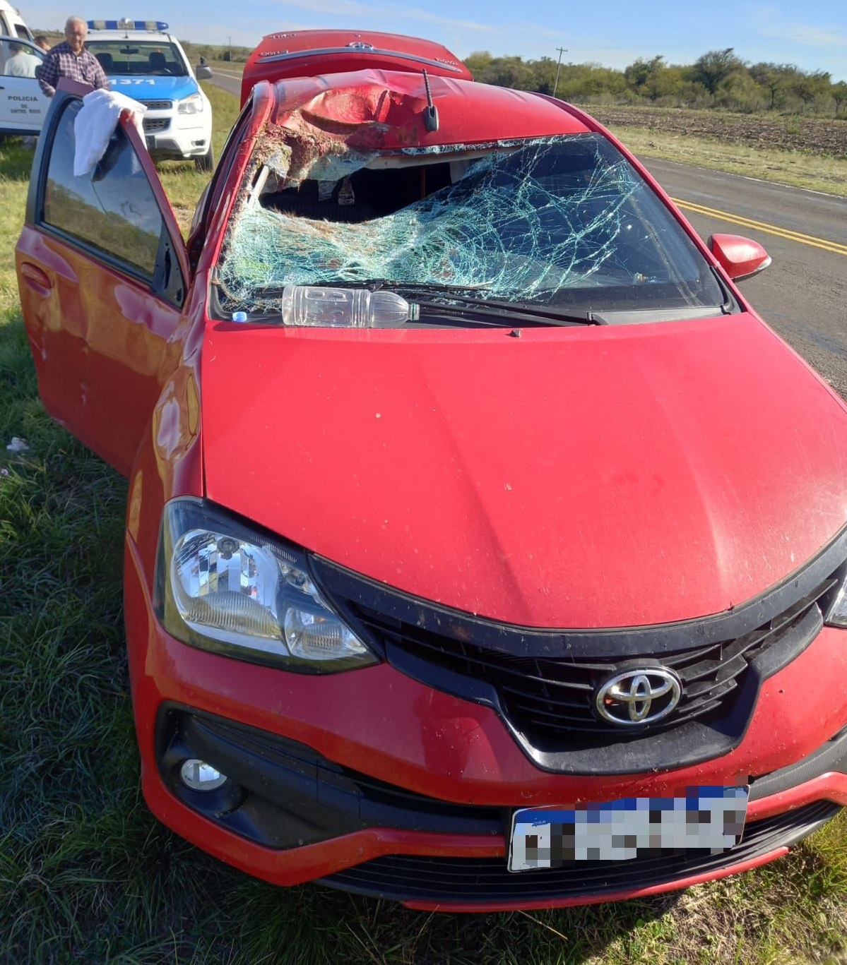 Un auto quedó con el parabrisas destrozado tras atropellar un ciervo en el kilómetro 603 de la Ruta Nacional N° 12, cerca de La Paz, la tarde de este sábado.