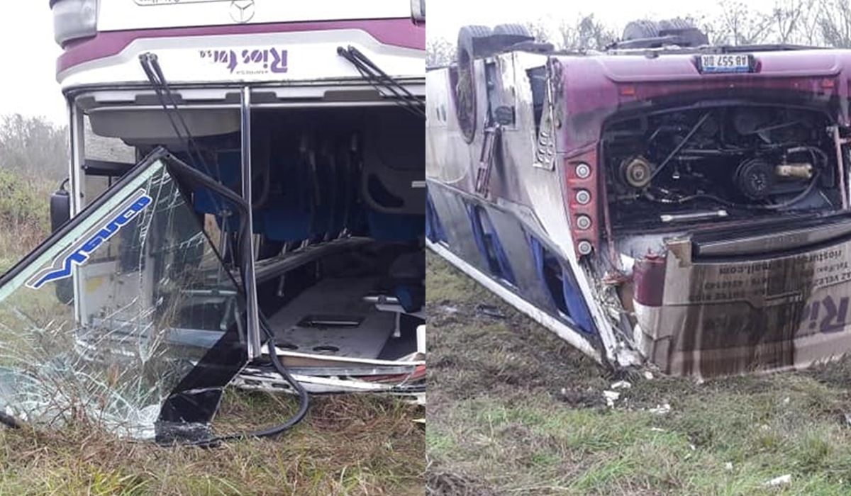 Por causas que se tratan de establecer, el chofer del micro perdió el control del vehículo de gran porte, que despistó y quedó con sus ruedas hacia arriba en una de las banquinas, provocando varios heridos leves y dos de gravedad.