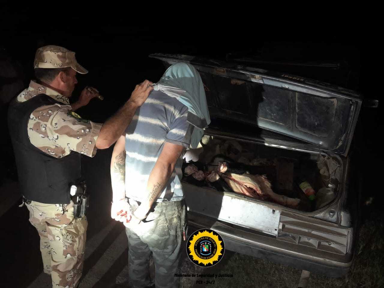 Durante el control policial, se descubrió que el individuo transportaba en el baúl del vehículo un ternero degollado, sin extremidades ni cabeza, y en una mochila llevaba las vísceras del animal.