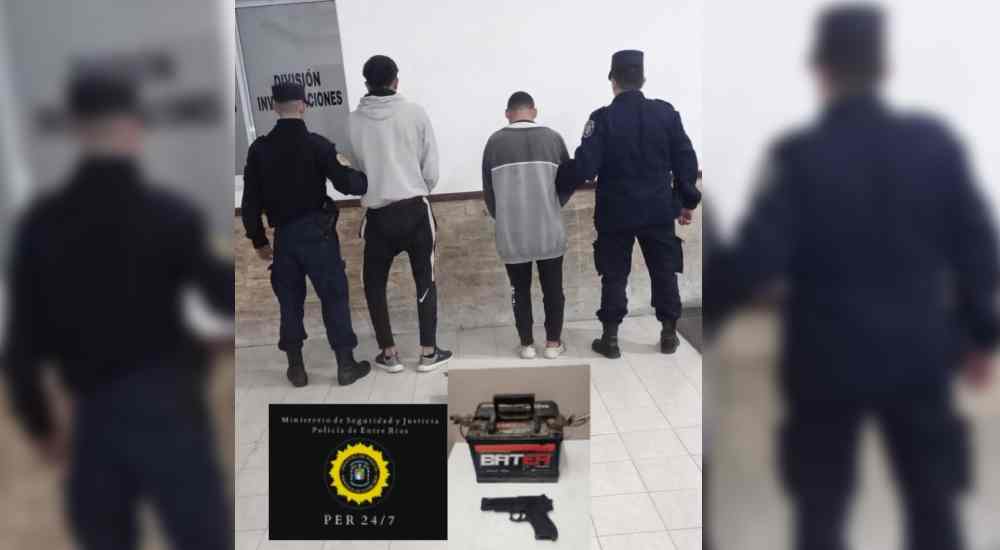 En la madrugada de hoy, el personal policial de la Jefatura Departamental de La Paz llevó a cabo la detención de dos individuos en la intersección de calle San Martín y Boulevard 25 de Mayo. Los sospechosos, de 22 y 28 años, fueron interceptados mientras portaban una batería para vehículos con cables cortados y bulones puestos, además de una réplica de plástico negro de un arma de fuego calibre 9mm.