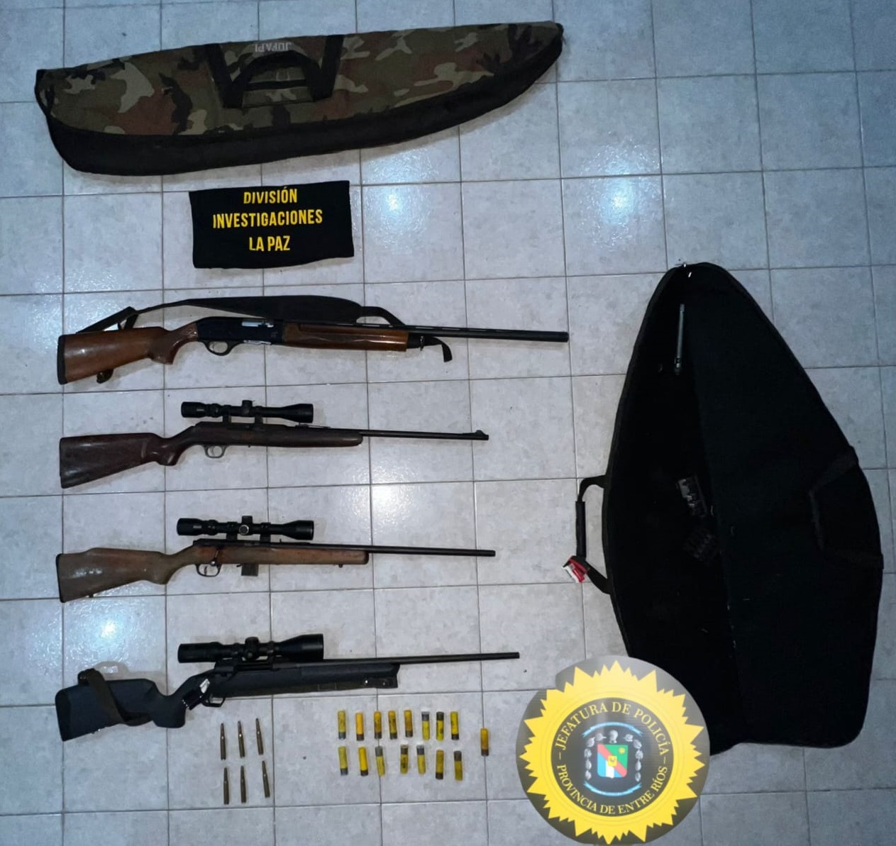 Como resultado del procedimiento, se secuestraron cuatro armas de fuego: una escopeta calibre 20, una carabina 22 mm, una carabina de repetición 30-06 y una carabina de repetición 22 mm, algunas de ellas con mira telescópica, como así también 16 municiones de diversos calibres, según detallaron a La Sexta desde la Departamental La Paz de Policía.