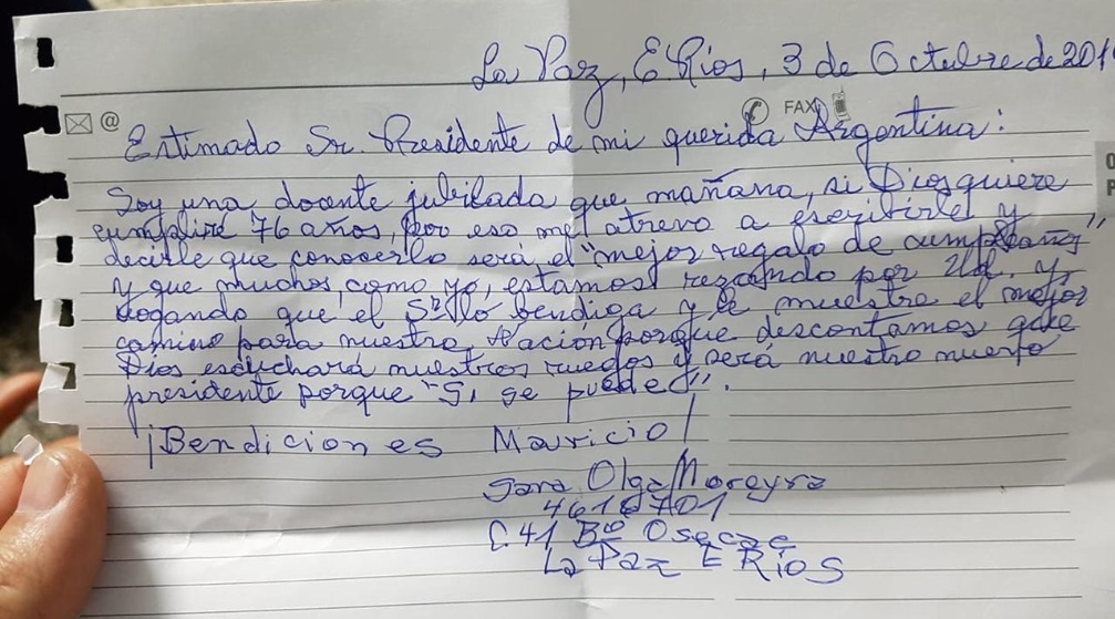 Una docente jubilada de 76 años de La Paz que padece el Mal de Alzheimer le escribió una carta a Mauricio Macri en el marco de la visita del presidente a esa ciudad, que ocurrió el jueves 3 de octubre de 2019 como parte del recorrido de la campaña "Sí se puede" con la que el mandatario intenta su reelección.