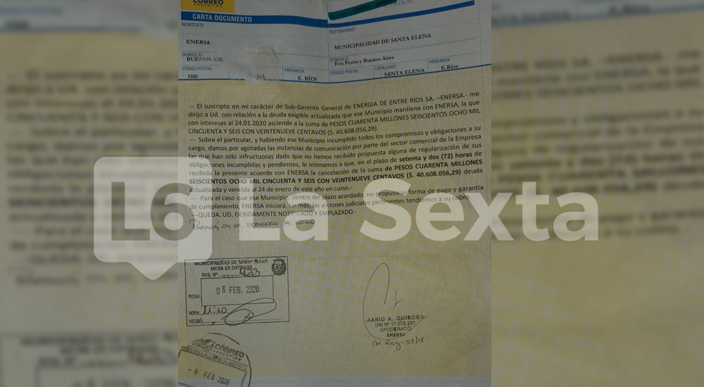 La Carta Documento de Enersa dice que el municipio le debe la suma de $40.608.056,29. “Sobre el particular, y habiendo ese municipio incumplido todos los compromisos y obligaciones a su cargo, damos por agotadas las instancias de comunicación por parte del sector comercial de la Empresa las que han sido infructuosas dado que no hemos recibido propuesta alguna de regularización de sus obligaciones incumplidas y pendientes, le intimamos a que, en el plazo de setenta y dos (72) horas de recibida la presente acuerde con Enersa la cancelación de la suma $40.608.056,29 deuda actualizada y vencida al 24 de enero de este año en curso”, expresó el apoderado legal de la empresa.