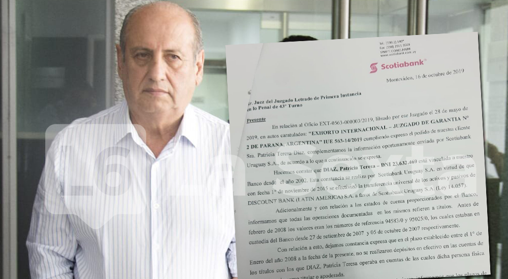 El escrito bancario remitido por el Scotianbank Uruguay, firmado por los apoderados Elvira Castro Magariños y Pablo Fernández Lexagues, dice: “En relación al oficio Ext-0563-000003/2019, llibrado por el juzgado el 28 de mayo de 2019, en autos caratulados: Exhorto internacional-Juzgado de Garantía N°2 de Paraná, Argentina” IUE 563-14/2019 cumpliendo expreso el pedido de nuestra cliente Sra. Patricia Teresa Díaz, complementamos la información oportunamente enviada por Scotianbank Uruguay SA, de acuerdo a lo que a continuación se expresa”.