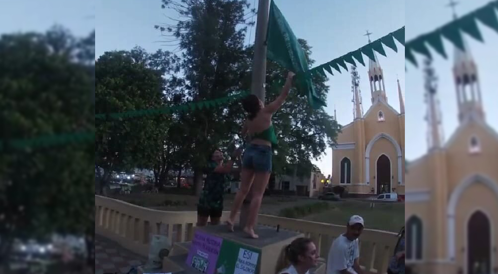 El pañuelo verde, símbolo de la lucha por el aborto legal, seguro y gratuito, fue izado como bandera en el mástil principal de la Plaza 25 de Mayo de La Paz.