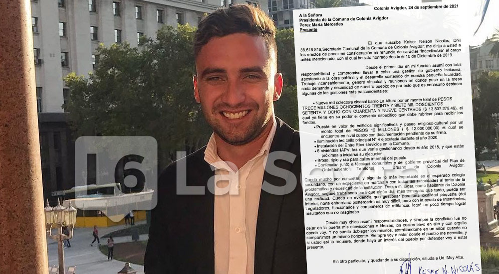 Nicolás Kaiser anunció este martes por la noche que presentó su renuncia indeclinable como Secretario de Gobierno de Colonia Avigdor, cargo en el que se desempeñaba desde el 10 de diciembre de 2019, bajo la dirección de la presidenta comunal María Mercedes Pérez (PJ). La dimisión formal fue el viernes 24 y la dio a conocer a través de un comunicado en el que habló de diferencias internas en la Comuna. "¿Si me sentí usado? Y la verdad que sí. Pero siento que a quien en verdad usaron fue al Partido Justicialista, para luego darle vuelta la cara e ir en contra de todos sus principios", dijo en un pasaje de su escrito.