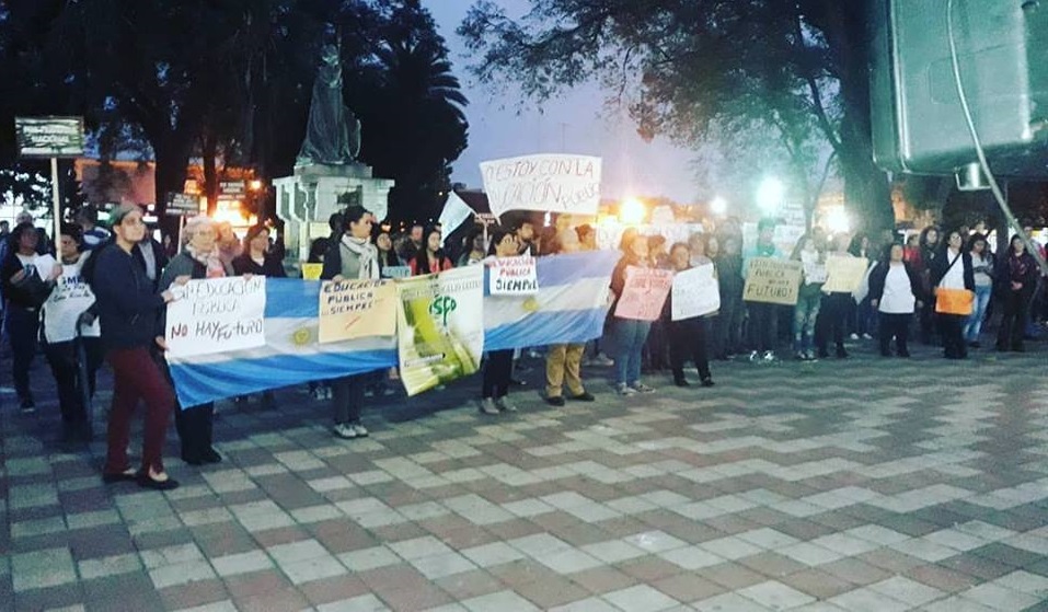 En la plaza principal de la cabecera departamental, a partir de las 18, una importante columna de personas levantó carteles en los que se pudo leer: "Estoy con la educación pública", "Que la educación sea un derecho, no un privilegio", "Sin educación no hay futuro", o "Educación Pública Siempre", con una gran Bandera Argentina de fondo.