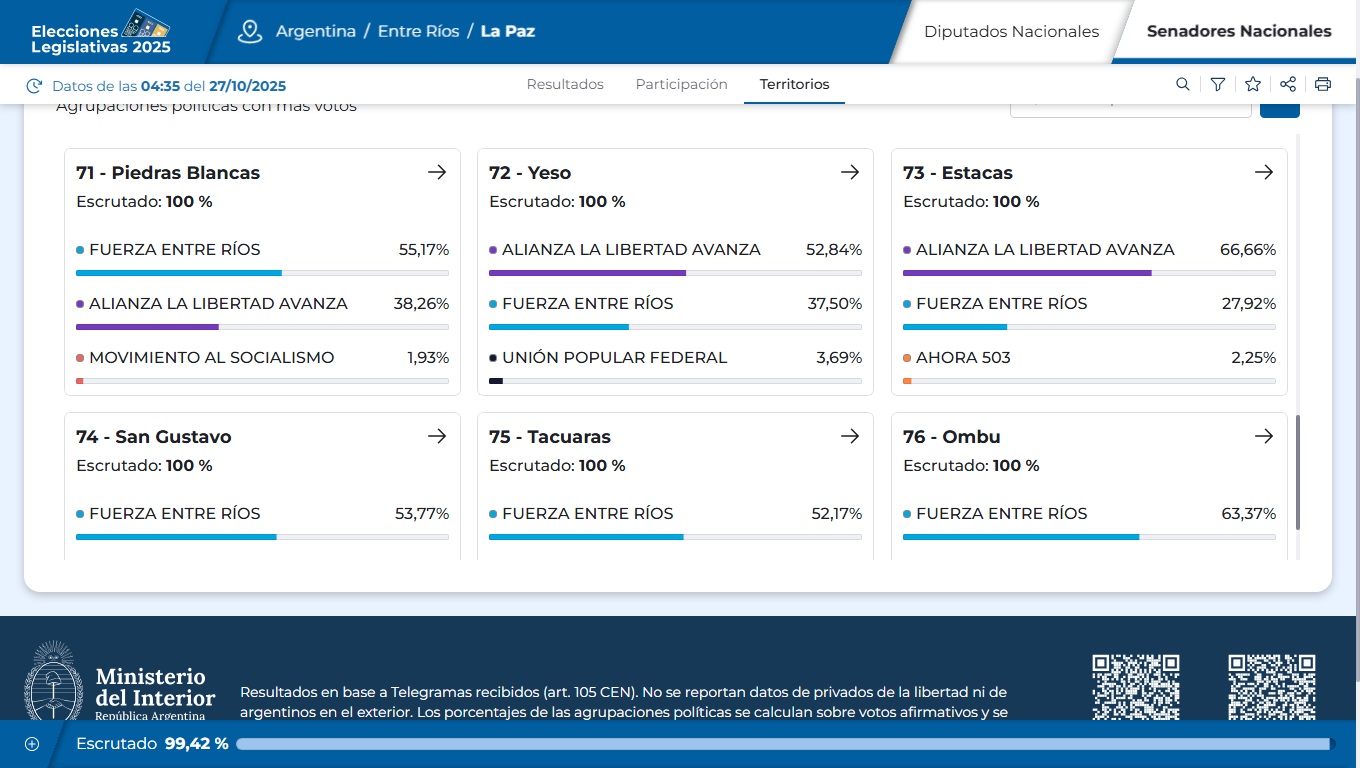 Sin embargo, en ciudades como San Gustavo y Piedras Blancas -como ocurrió en Santa Elena-, se impuso la lista peronista Fuerza Entre Ríos con más del 54% de los votos.