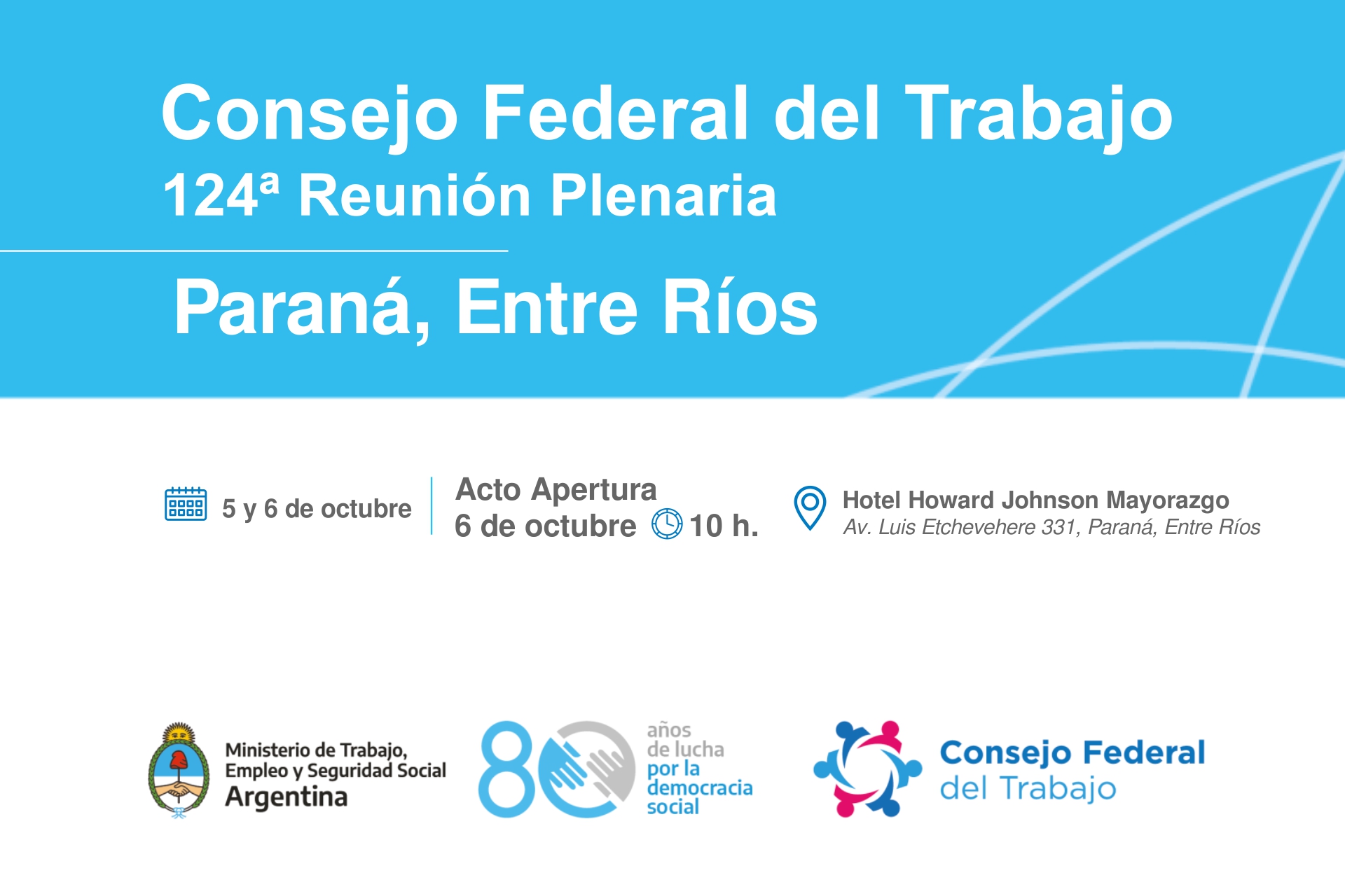 Con la presencia de autoridades nacionales y los titulares de las 24 carteras laborales del país, durante jueves y viernes de esta semana, el Consejo Federal del Trabajo realizará su 124º reunión plenaria en Paraná.