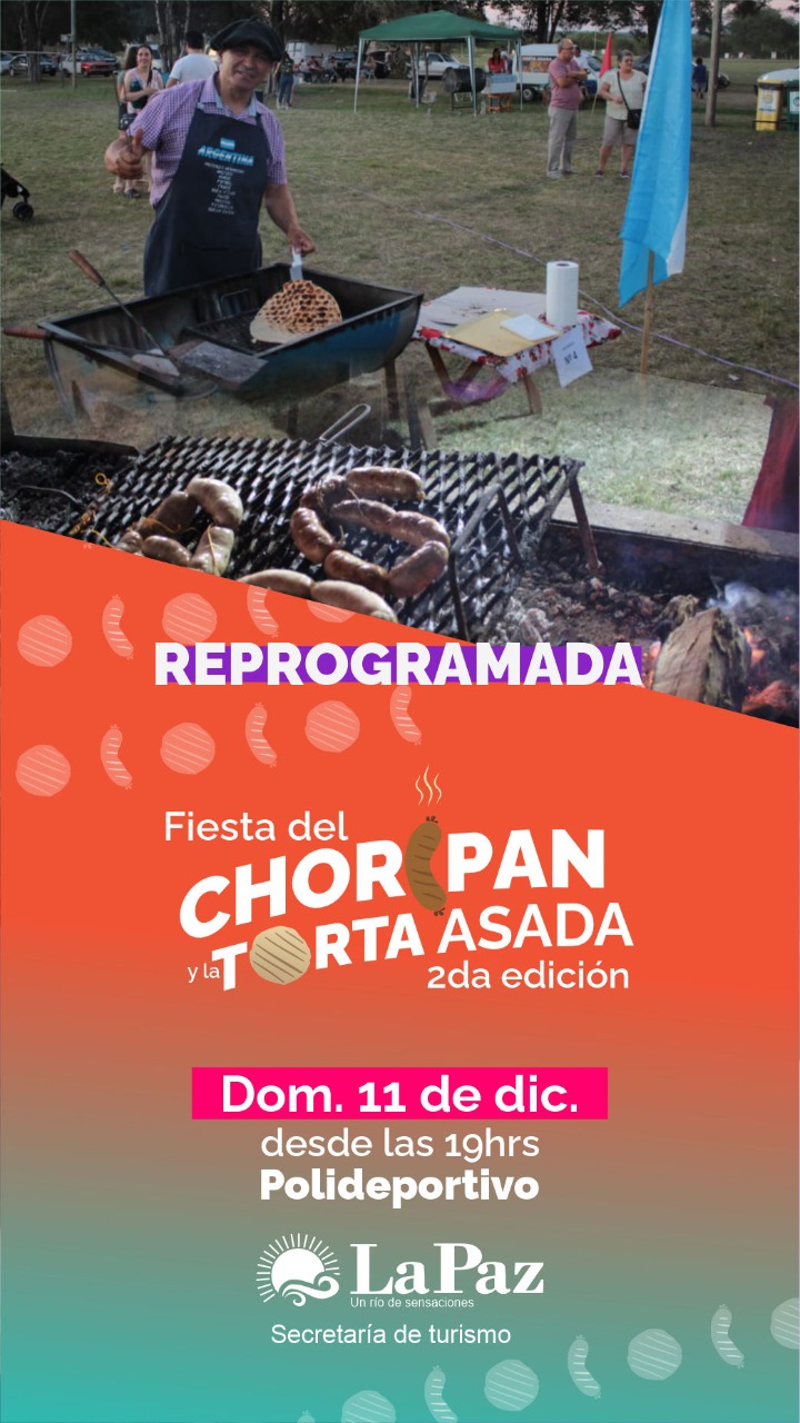 La segunda edición de la Fiesta del Choripán y la Torta Asada de La Paz, que se volvió a postergar por mal tiempo y finalmente se realizará el domingo 11 de diciembre a partir de las 19:00, en el Polideportivo municipal, con la presentación de bandas en vivo.