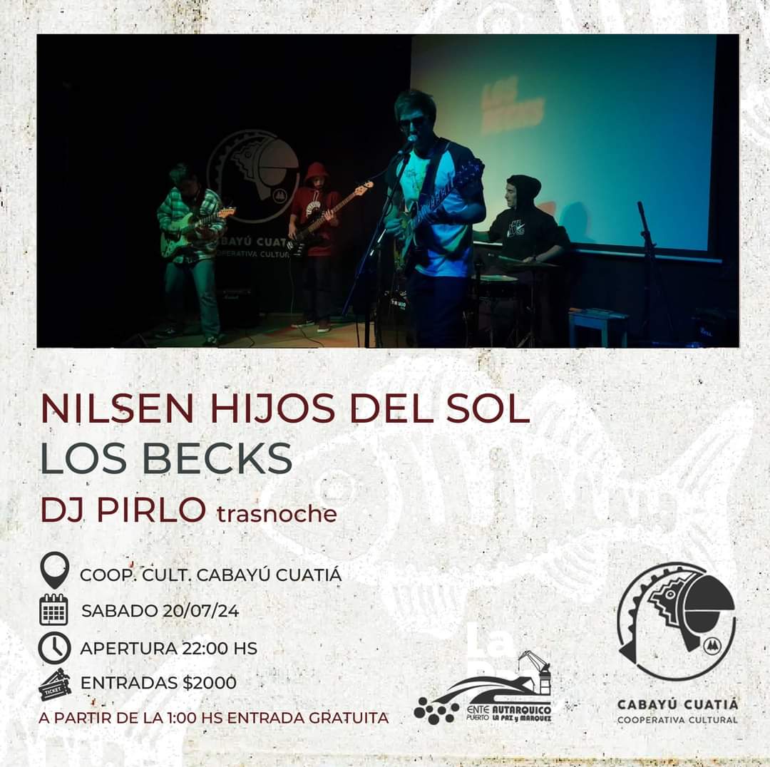Este sábado 20 de julio será una noche llena de ritmo y buena energía en el Centro Cultural Cabayú Cuatiá, de La Paz. A partir de las 23, se presentarán en vivo Nilsen hijos del sol y Los Becks, dos bandas que prometen hacer vibrar el escenario con su música.