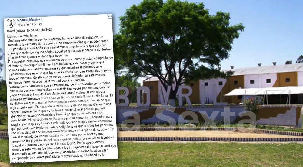 "Ya pasadas unas horas y con el primer parte médico que no nos daba esperanza, dado que su estado era muy crítico, empezamos todos los familiares a tener que recibir mensajes y capturas de pantallas que daban por cierto con nombre y apellido que en Bovril ya estaba instalado el Covid – 19 dando en su carácter de ingenieros opinólogos en de todo un poco, pero sin saber un carajo, información errónea solo para generar pánico, cosa que está penada por la ley pero que en su notable ignorancia nos dieron las pruebas suficientes para poder denunciarlos", escribió.
