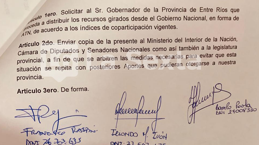El Honorable Concejo Deliberante de La Paz aprobó por mayoría un proyecto de resolución en el que le solicita al gobernador Gustavo Bordet la distribución de los Aportes del Tesoro Nacional (ATN), girados por el gobierno nacional.