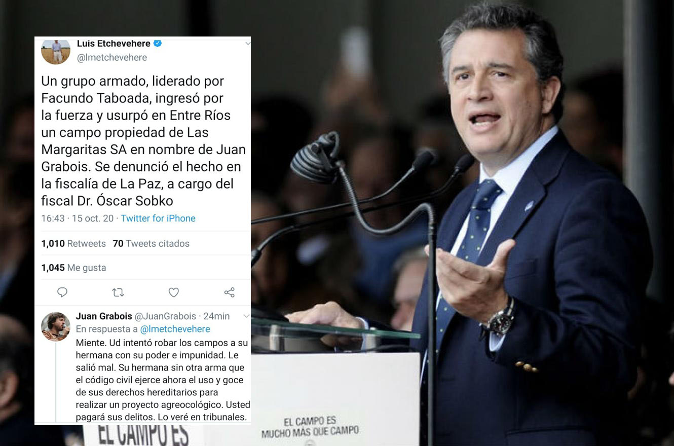 Esta tarde, el exministro Luis Miguel Etchevehere deunció ante la Fiscalía de La Paz, a cargo de Oscar Sobko, la supuesta usurpación del campo. "En el día de la fecha un grupo de 40 desconocidos en una decena de autos, liderados por Facundo Taboada, ingresaron por la fuerza, con armas en su poder, al establecimiento rural “Casa Nueva“, propiedad de Las Margaritas SA, Ubicado en el Departamento La Paz, Provincia de Entre Rios", señaló la familia Etchevehere en un comunicado.